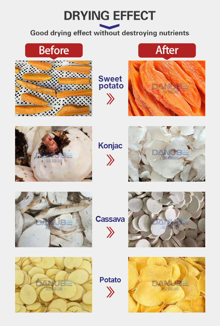 The dryer adopts medium and low temperature drying. After drying, the original color and nutrients of cassava can be completely retained. The equipment is made of stainless steel, in line with food machinery standards.