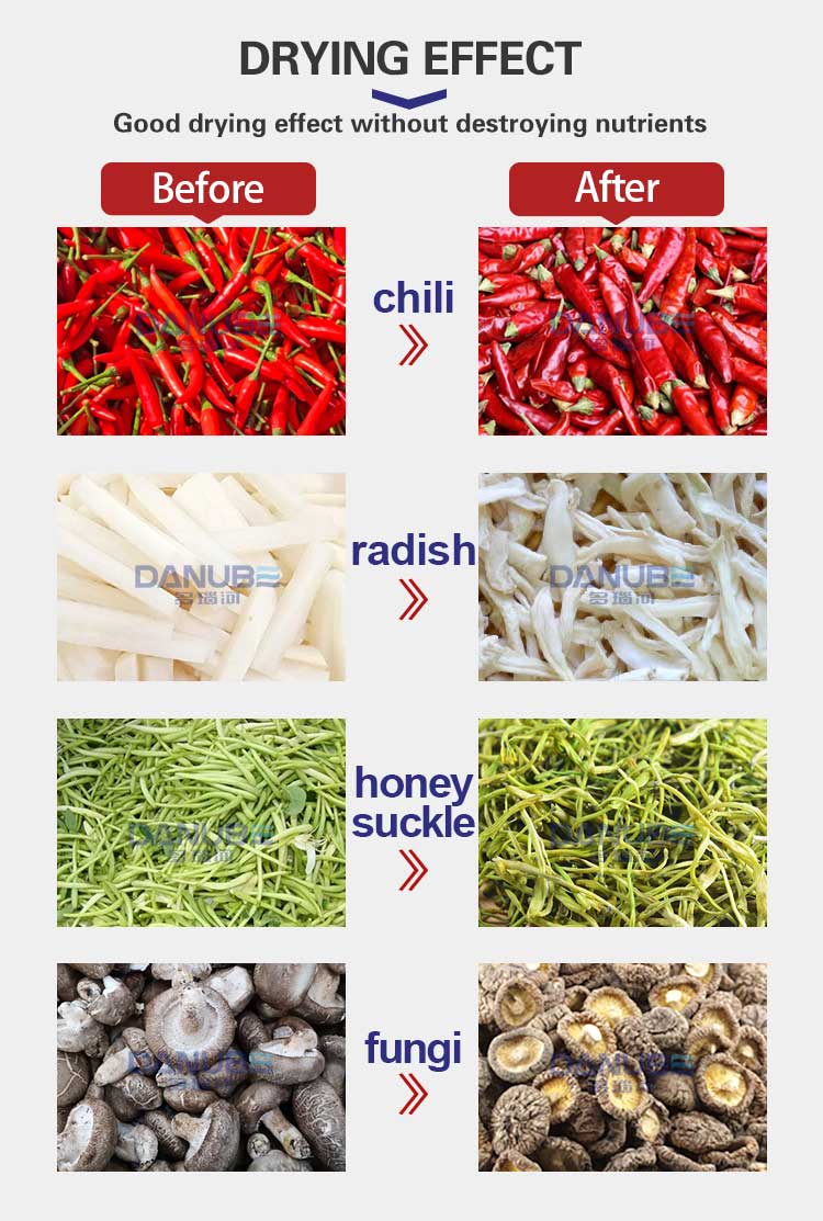 The dryer adopts medium and low temperature drying. After drying, the original color and nutrients of chili can be completely retained. The equipment is made of stainless steel, in line with food machinery standards.