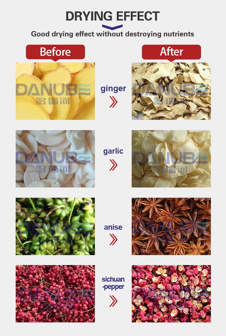 The dryer adopts medium and low temperature drying. After drying, the original color and nutrients of ginger can be completely retained. The equipment is made of stainless steel, in line with food machinery standards.