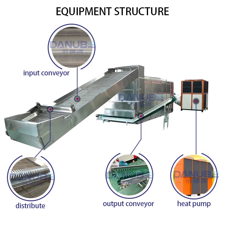 2:After the fruit enters the fruit dryer, it runs in an “S”; shape in the dryer. The transmission part of the fruit dryer adopts a variable-frequency speed-regulating motor, which can control the internal operation time of the drying according to the difference of the water content of the fruit.