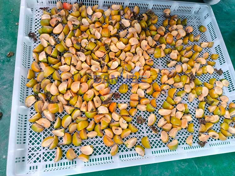 The storage hopper and the conveyor belt are directly combined, and the template is selected according to the diameter of the fruit, and the fruit is poured into the storage hopper, and only four people are placed in the template hole to achieve the effect of feeding and conveying, and after the hole is positioned, The fruit continues to be transported and propelled, and the fruit is rushed by the process of the machine tool during the process of conveying and pushing, and the nuclear nucleus is automatically flowed out and collected in the core, and the fruit that has passed through the core continues to be transported to the next step to automatically drop the fruit. The shape of the discharged fruit is completely unchanged, and the fruit is dropped into the crucible and automatically collected and collected to achieve the separation of the fruit and the core.